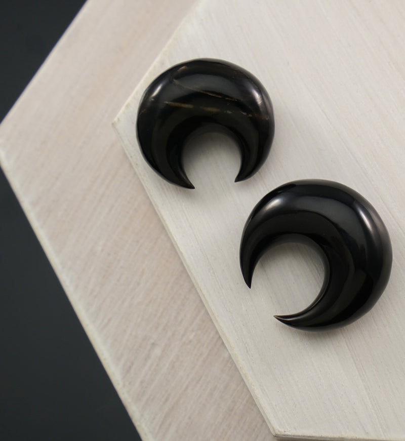 Septum pinchers handcrafted from dark horn. Polished and smooth. Available in sizes 14G (1.6mm) - 1/2" (13mm). You can wear these in your stretched septum or stretched ears! Do not use these to stretch your septum or ear lobes. Please note that each piece will be unique in color and pattern due to the nature of the horn. Sold individually (1pc). Purchase 2 for a pair. See below for full measurements of each size.