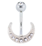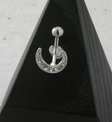 Beautiful belly button ring with a crescent moon design that is similar to a horseshoe shape. Filled with sparkling, clear cz gems. Size is 14G with a 3/8" 10mm barbell. It is made from 316L stainless steel. Externally threaded. Top cz measures at about 5mm. Bottom design is about 12mm x 10mm. Sold individually (1 pc). For healed piercings.