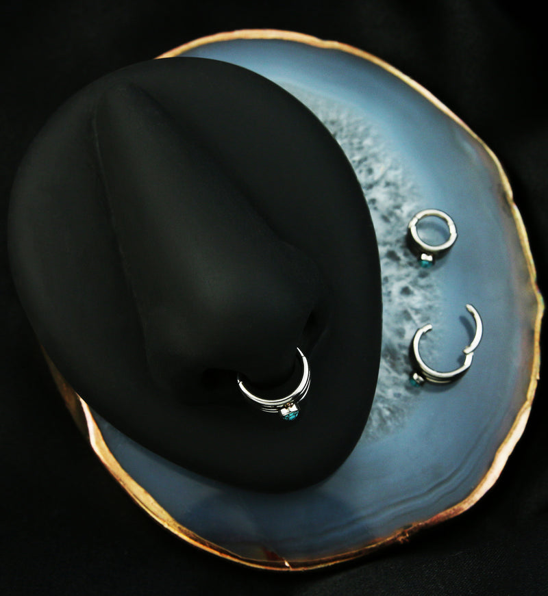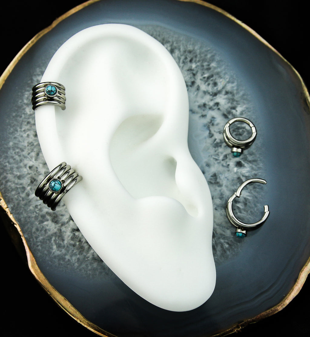 Made with 316L stainless steel, this hinged segment ring has a stacked design forming more of a cuff look. In the center is a 3mm howlite turquoise stone gem. Size is 16G with an inner diameter size of either 1/4" (6mm) or 5/16"(8mm). Great jewelry piece for tragus or cartilage piercings! Sold individually (1pc).