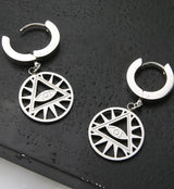 Huggie earrings with a dangling "all seeing eye" of the Illuminati attached. Made from 316 stainless steel. Size is 18G. Diameter is 1/2" (13mm). Total length is approximately 32mm. The hinged design is easy to open and close. Sold in pairs (2 pieces).
