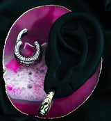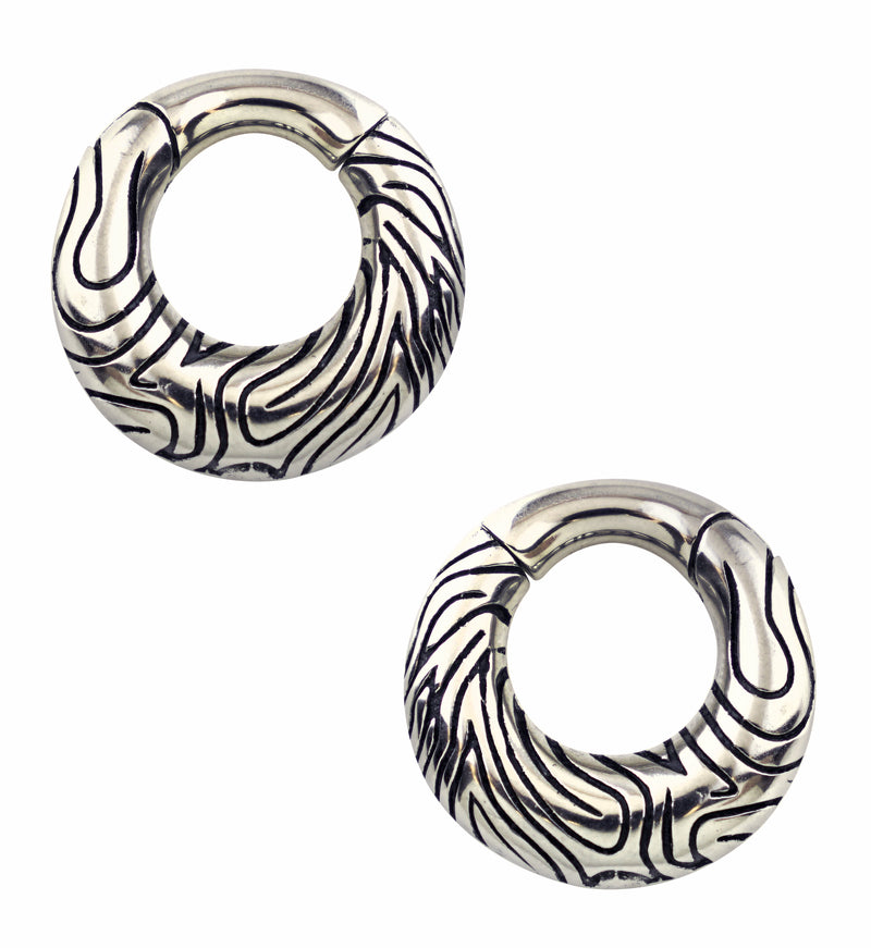 Hinged ear weights with a etched lines that are inspired from a fingerprint. Made from surgical 316L stainless steel with an easy hinged design. Height is 25mm, width is 25mm, weight is 15 grams each. Must be 6G or larger to wear. For healed lobes/piercings. Sold in pairs.