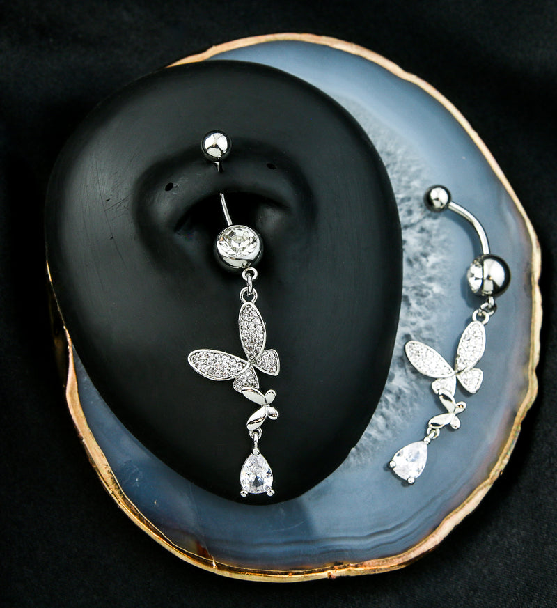 Beautiful belly button ring with a double dangling butterfly design. The larger butterfly is filled with paved clear cz gems. Attached is a dangling 8mm teardrop cz gem Size is 14G with a 3/8" (10mm) barbell. It is made from 316L stainless steel. Externally threaded. Top ball measures at about 5mm. Bottom cz is about 8mm. Bottom design measures about 34mm x 15mm. Sold individually (1 pc).