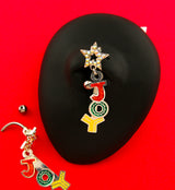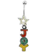 Festive belly button ring for your jewelry collection! Made with 316L stainless steel and featuring the letters J, O, and Y which spell out JOY and dangles from the top which is a 13mm star cut out that is filled with rainbow aurora cz gems. The design measures about 30mm x 20mm. This piece is designed to fit healed navel piercings and measuring 14G with a 7/16” (11mm) barbell length. The bottom ball measures 5mm. For healed piercings.