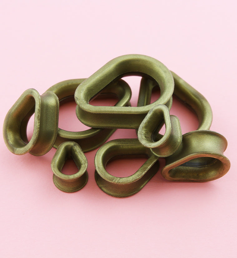 Kaos Gold Silicone Hydra Eyelets are made with the highest quality implant grade silicone and manufactured in the USA. These have a teardrop shape. This pair comes in sizes 00G gauge up to 1" with a 8mm (5/16") wearable surface from 00G to 1 inch. Soft and squishy, they can be washed with a mild non scented antibacterial soap and water. These are slightly thicker than the other skin eyelets but still flexible. Note: DO NOT USE for ear stretching.