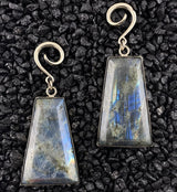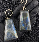 Sold in pairs (2 pieces) Natural labradorite stone NOTICE: This is the exact pair you will receive 4G or bigger to wear Handle with care Size: 85mm x 38mm +- Weight: 55 grams each White brass hooks Brass is not meant for long term wear May oxidize under extreme moisture conditions