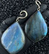 Sold in pairs (2 pieces) Natural labradorite stone NOTICE: This is the exact pair you will receive 4G or bigger to wear Handle with care Size: 110mm x 58mm +- Weight: 99 grams each White brass hooks Brass is not meant for long term wear May oxidize under extreme moisture conditions