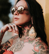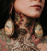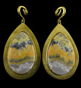 Sold in pairs (2 pieces) 4G or bigger to wear Bumblebee jasper stone Every set will be unique in shape & color Handle with care Casted in brass Size: 110mm x 58mm +- Weight: 46 grams each Brass is not meant for long term wear May oxidize under extreme moisture conditions