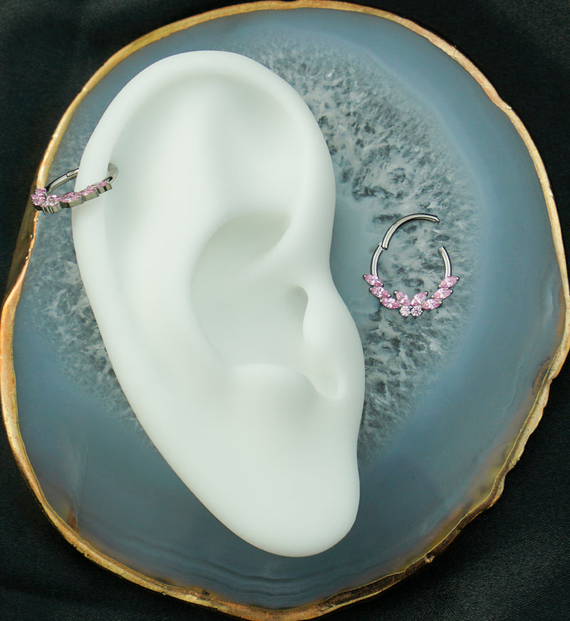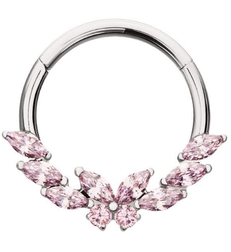 Hinged segment ring made from durable ASTM F-136 titanium with wreath design along the bottom that is made from marquise light pink cz gems and a centered butterfly design which is filled with pink cz gems. Size is 16G. Inner diameter size is 3/8" (10mm). The hinged design makes this hoop ring piece effortless to put in and take out. Pretty piece for cartilage or septum piercings! Sold individually.