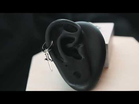 Hoop-style earrings with a dangling lightning bolt dagger attached that measure about 22mm x 10mm. Made from 316L stainless steel with a hinged clasp. Size is 18G. Diameter is 3/8" (10mm). Total length is approximately 34mm. The hinged design is easy to open and close. Sold in pairs (2 pieces).