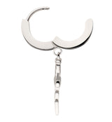 Hoop-style earrings with a dangling lightning bolt dagger attached that measure about 22mm x 10mm. Made from 316L stainless steel with a hinged clasp. Size is 18G. Diameter is 3/8" (10mm). Total length is approximately 34mm. The hinged design is easy to open and close. Sold in pairs (2 pieces).