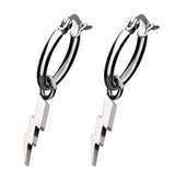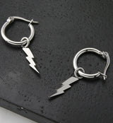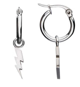 Hoop earrings with a dangling lightning bolt attached. Made from 316 stainless steel. Size is 20G. Diameter is 1/2" (13mm). Total length is approximately 32mm. The hinged design is easy to open and close. Sold in pairs (2 pieces).