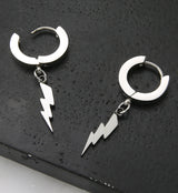 Huggie earrings with a dangling lightning bolt attached. Made from 316 stainless steel. Size is 18G. Diameter is 1/2" (13mm). Total length is approximately 32mm. The hinged design is easy to open and close. Sold in pairs (2 pieces).