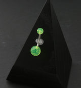Add some sparkle to your belly button ring collection! These belly rings are made from stainless steel and have a lime green, glittering UV acrylic ball at each end, measuring at 5mm and 8mm. The length is 3/8" and 14g. Also available several other colors! Externally threaded. Sold individually. For healed piercings.
