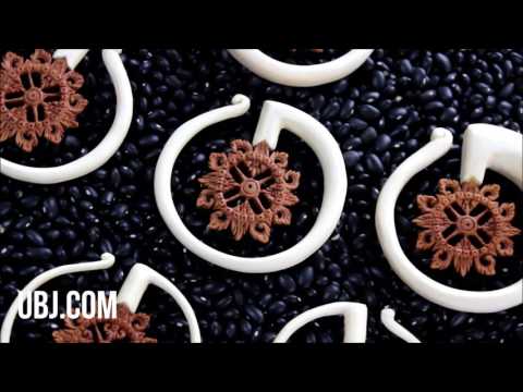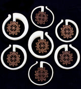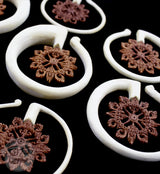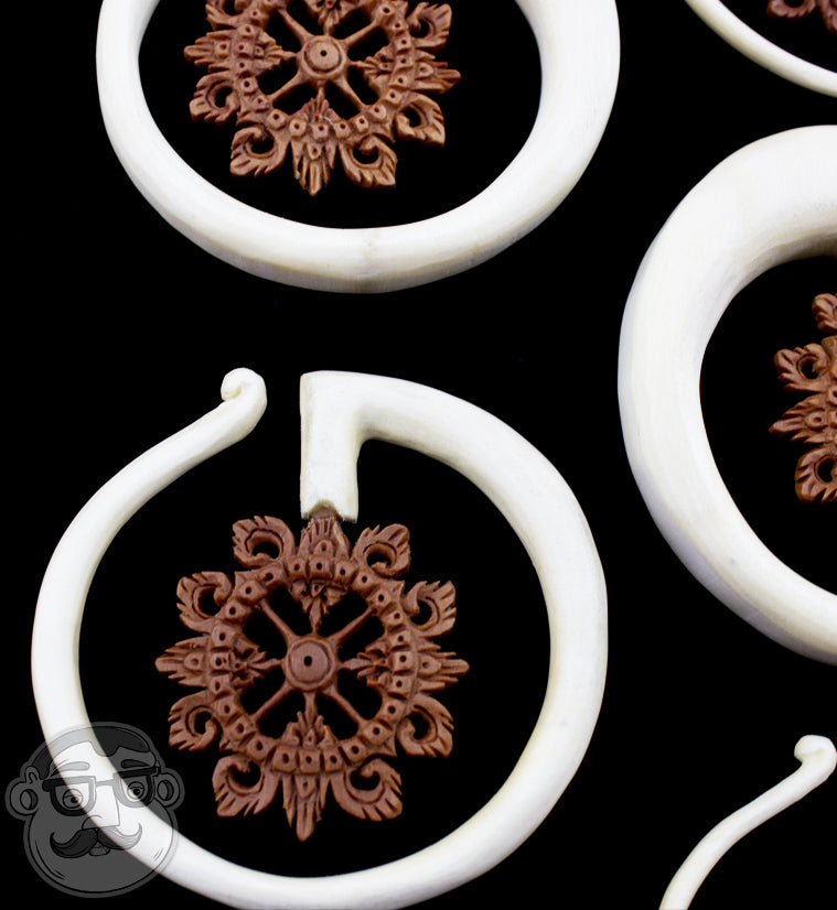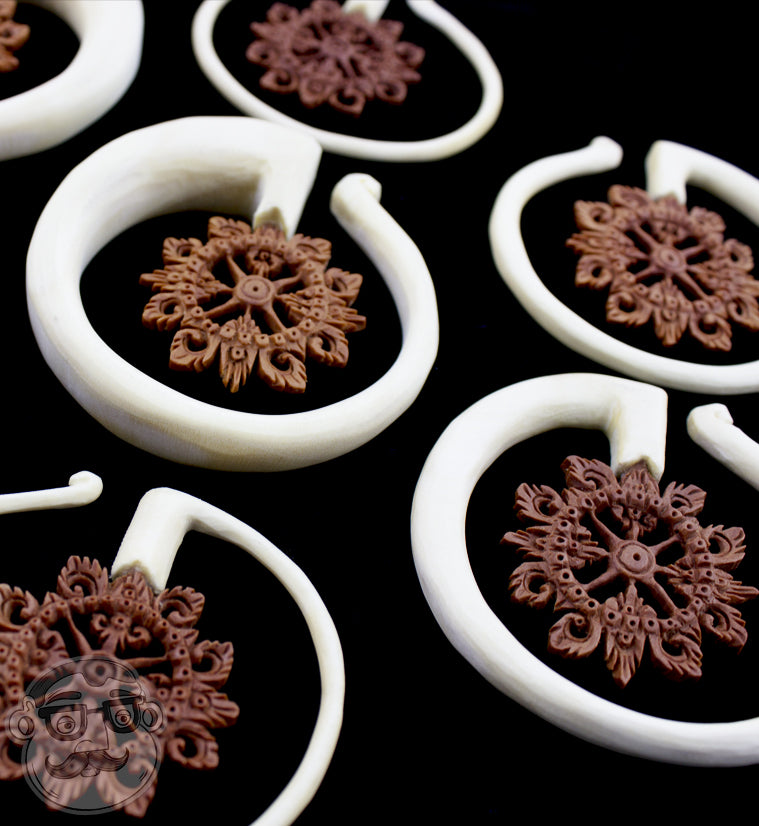 This is a new design we are testing out. Pick from 1/2" (12mm) or 9/16" (14mm). Sold in pairs (2 pieces). Handcrafted - each piece will be slightly unique. Carved sun flare design. Crocodile & saba wood. Approximate size: 70mm x 70mm. NOTE: Pattern & color will be unique for each piece, we will do our best to find you a complementing pair.