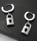 Huggie earrings with a dangling lock attached. Made from 316 stainless steel. Size is 18G. Diameter is 1/2" (13mm). Total length is approximately 28mm. The hinged design is easy to open and close. Sold in pairs (2 pieces).