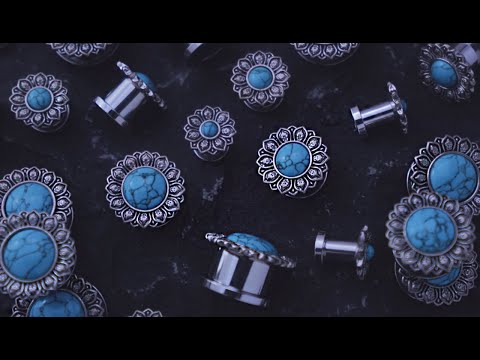 Screw back tunnels plugs with an ornamental flower design around a synthetic howlite turquoise stone. Made from 316L stainless steel. Available sizes: 2G (6mm), 0G (8mm), 00G (10mm), 7/16" (11mm), 1/2" (12mm), 9/16" (14mm), 5/8" (16mm). Full Length: 13mm X Wearable area: 8mm. Sold in pairs (2pcs).