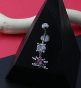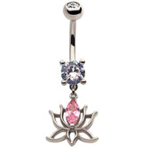 Be zen with this calming lotus flower belly button ring. Made with 316L stainless steel and a dangling, lotus flower with a pink cz gem in the middle. Barbell size is 14G with a 3/8" (10mm) length. Externally threaded. For healed piercings.
