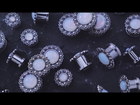 Screw back tunnels plugs with an ornamental flower design around a shining, synthetic white opal gem. Made from 316L stainless steel. Available sizes: 2G (6mm), 0G (8mm), 00G (10mm), 7/16" (11mm), 1/2" (12mm), 9/16" (14mm), 5/8" (16mm). Full Length: 13mm X Wearable area: 8mm. Sold in pairs (2pcs).