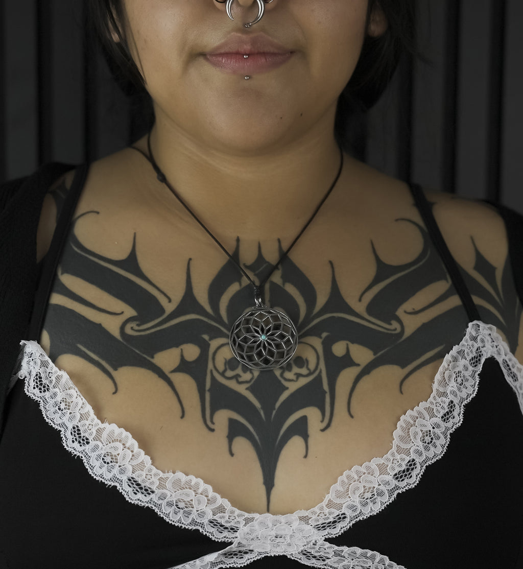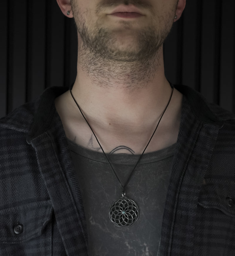 Made with white brass and a 3mm turquoise howlite inlay, this 42mm x 42mm lotus of life design is a unique statement piece. The adjustable cotton cord and 0.8" (2mm) thickness ensures comfort. Sold individually.