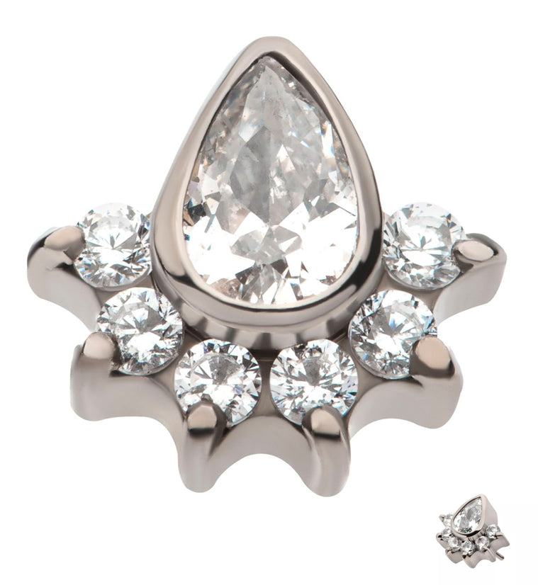 Threadless top piece that has a teardrop, clear cubic zirconia gem design with an accented row of clear cz gems along the bottom. Made from ASTM F-136 titanium. Measures about 5.5mm x 5mm. Fits most threadless posts. Pin length is 5mm. Sold individually (top piece only).