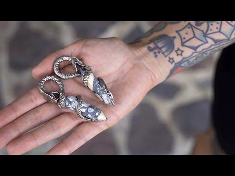 Handcrafted white brass ear weights with a cobra snake design wrapped around a maligano jasper stone piece. Height: 80mm, width: 26mm. Height and width are approximate as these are handcrafted. Size is 2G (6mm) with an approximate weight of 35 grams each. Sold in pairs (2pcs).