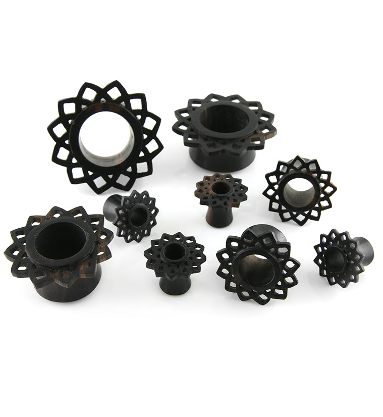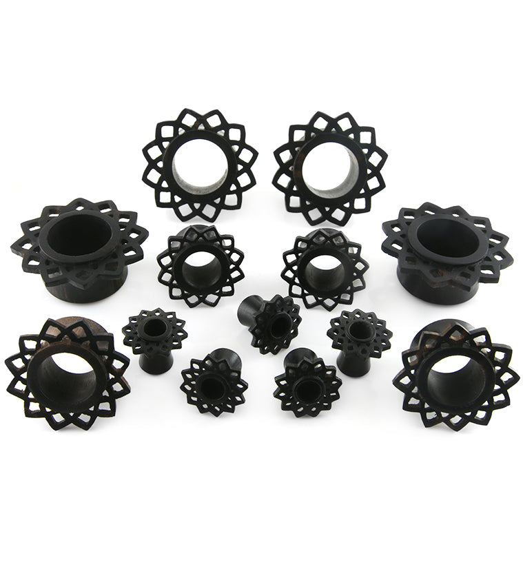 Handmade from Areng wood, these double flared tunnels feature a detailed Mandala flower design. Sold in pairs, pick your size from 0G (8mm) to 1 & 1/4" (32mm). Designed for healed lobes, these tunnels should be kept out of water. Maximum comfort with a wearable area of 12mm to 13mm.