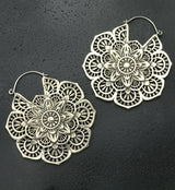 Complete your look with our Mandala Flower Brass Titanium Hangers. Sold in pairs, these earrings are crafted from ASTM f-136 titanium wire for durability. With a width of 45mm and height of 58mm, each weighs about 10 grams. (Note: Brass may oxidize in extreme moisture, so wear these beauties with caution for long term wear.)