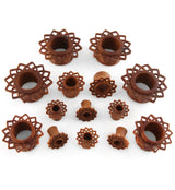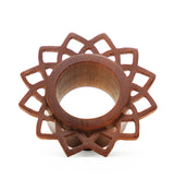 Handmade from Saba wood, the Mandala Flower Tunnels are sold in pairs and feature double flares for a secure fit. Perfect for healed lobes, these tunnels come in various sizes with a comfortable wearable area. Keep them dry and showcase your style with these intricately designed tunnels.