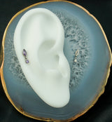 Made with ASTM F-136 titanium milled in Japan, this threadless top piece has a 6mm marquise amethyst cz gem connected to a dangling, 2mm, round amethyst gem. Full design measures about 11.2mm x 2.5mm. This top has a threadless design and fits most threadless posts. Sold individually.