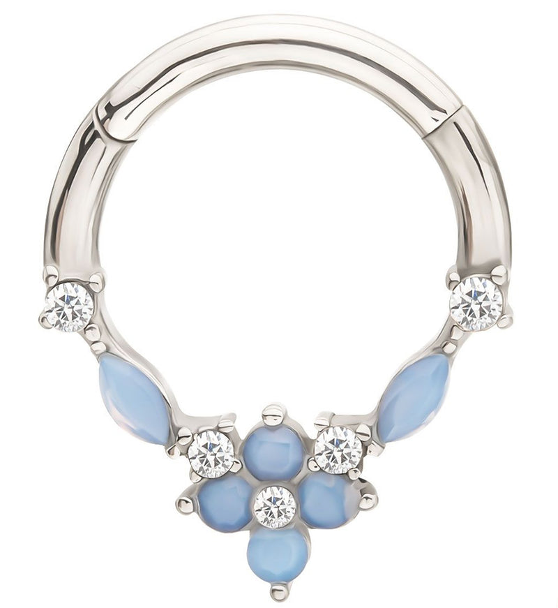 This hinged segment ring has a beautiful flower design along the bottom that is made up of blue opalite gems and accented clear cz gems. Made from 316L stainless steel. Inner diameter size is 3/8" (10mm) with your choice of gauge size: 16G or 14G. The hinged design makes this piece easy to put in and take out. Sold individually. For healed piercings.
