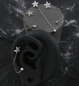 Connecting, dangling chain threadless top pieces, one end with a 3.5mm bezel set clear cz gem and the other end has a flower design made from marquise clear cz gems. Made from ASTM F-136 titanium. Full length including chain measures about 56mm long. 25G pins. Fits most threadless posts. Sold individually (top piece only).