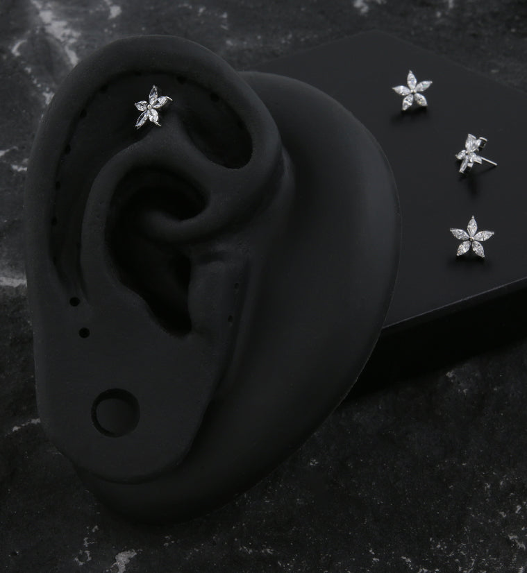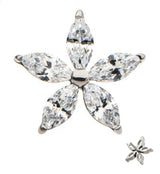 Threadless top piece that has a flower design made from five marquise clear cz gems. Fits all threadless posts. Made from ASTM F-136 titanium. Length is approximately 5mm. Top size: 6.8mm x 6.7mm. Sold individually (1pc, top only).