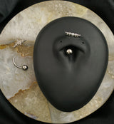 This belly button has a pretty, arched design that is filled with round, clear cz gems and a centered, marquise clear cz gem. It is made from strong ASTM F-136 titanium and is threadless with a 25G pin. The threadless design makes this piece easy to put in and remove from your piercing. Size is 14G with a 3/8" (10mm) wearable length. The bottom ball measures 5mm and the top design measures 12mm x 6mm. Sold individually.
