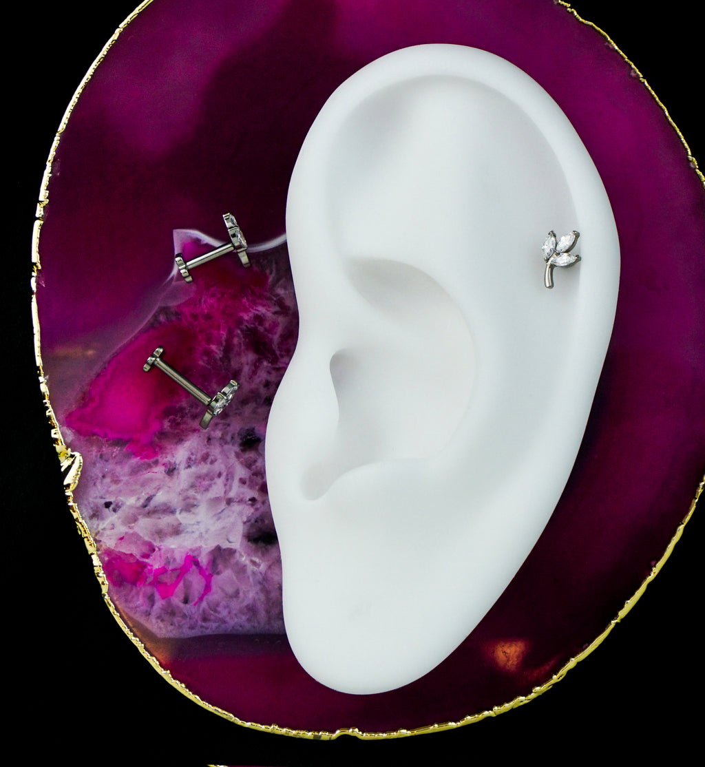 Cute threadless labret option that has a leaf design that is accented with marquise clear cz gems. The design measures about 8mm x 5mm. It is made from durable ASTM F-136 titanium and has a 25G pin and 4mm flower-shaped, flat back. Sold individually, it is available in size 16G with either a 1/4" (6mm) or 5/16" (8mm) wearable length to choose from. Pretty labret piece for cartilage or tragus piercings!