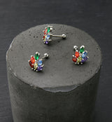 Barbell with a cluster of marquise, cz gems in the shape of a fire or bush. Made from 316L stainless steel and externally threaded. Gem colors include: red, orange, light yellow, green, light blue, and purple. Colorful option for cartilage or tragus piercings! Size is 16G with a bar length of 1/4" (6mm). End size is 8mm x 10mm. Sold individually. For healed piercings.