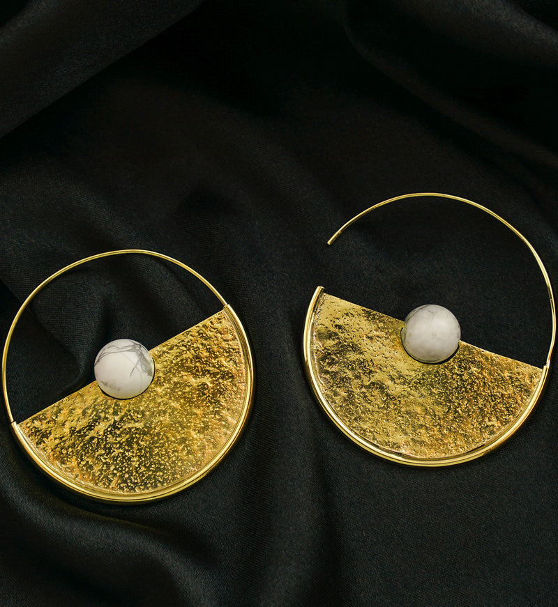 These 18G Meridian Howlite Sphere Brass Earrings - Hangers are uniquely designed. These have a half-circle shape with a textured design that gives each earring some shimmer. Each piece has a height and width of 55mm and a centered white howlite stone. Each earring weighs about 6 grams. Made from brass, these earrings are suitable for short-term wear, and may oxidize in extreme moisture conditions. Sold in pairs (2pcs).