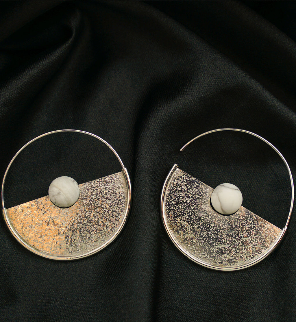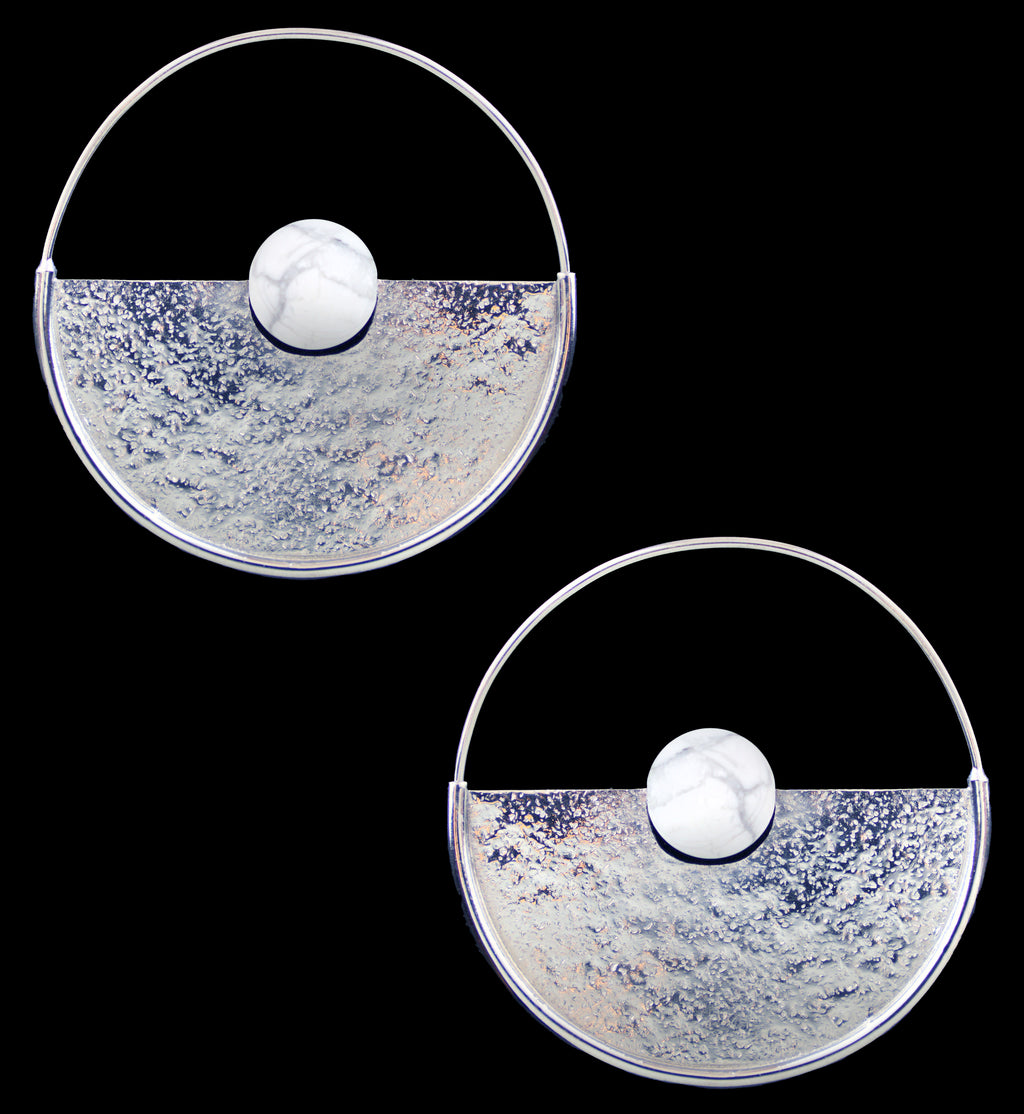 These Meridian Howlite Sphere White Brass Earrings - Hangers are uniquely designed with a have a half-circle shape and a textured design that gives each earring some shimmer. Each piece has a height and width of 55mm and a centered white howlite stone. Each earring weighs about 6 grams. Made from white brass, these earrings are suitable for short-term wear, and may oxidize in extreme moisture conditions. Sold in pairs.