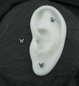 Threadless top piece that has a mini butterfly design that is made up of marquise and round amethyst cz gems. Made from durable ASTM F-136 titanium. Measures 5.3mm x 4.3mm. Fits most threadless posts as it has a 25G pin. Pretty top piece for your cartilage or tragus piercing! Sold individually (top only).