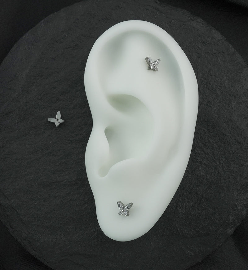 Threadless top piece that has a mini butterfly design that is made up of marquise and round clear cz gems. Made from strong ASTM F-136 titanium. Measures 5.3mm x 4.3mm. Fits most threadless posts as it has a 25G pin. Cute piece for your cartilage or tragus piercing! Sold individually (top only).