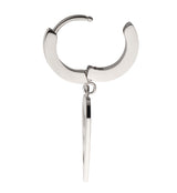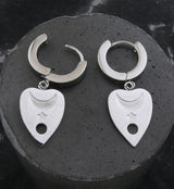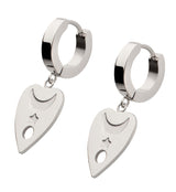 Hoop-style earrings with a dangling planchette shape attached that is stamped with a star and crescent moon. It measures about 20mm x 12mm. Made from 316L stainless steel with a hinged clasp. Size is 18G. Diameter is 3/8" (10mm). Total length is approximately 34mm. The hinged design is easy to open and close. Sold in pairs (2 pieces).