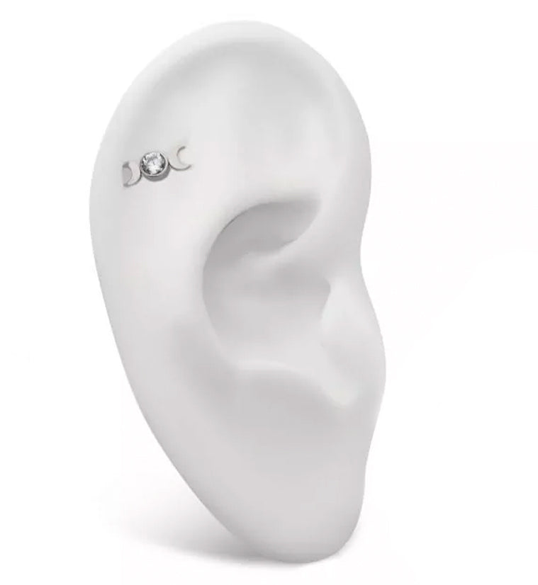 Beautiful top piece that has a centered, bezel-set, clear cz gem and two, flat, crescent moon shapes on either side. Made from ASTM F-136 titanium with a 25G pin. Measures at approximately 10mm x 4mm. Sold individually (1 piece - top only).