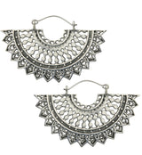 Lightweight white brass earrings/hangers with a fanned out design filled with beaded accents. Size is 18G. Measures at 40mm x 60mm. Weight is about 9.9 grams each. Made from white brass with a 316L stainless steel wire. Not meant for long term wear. May oxidize under extreme moisture conditions. Sold in pairs (2pc). For healed piercings/lobes.