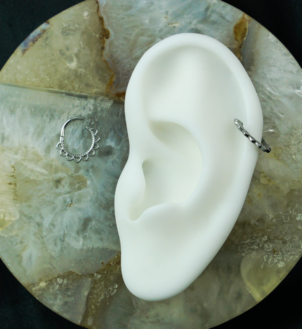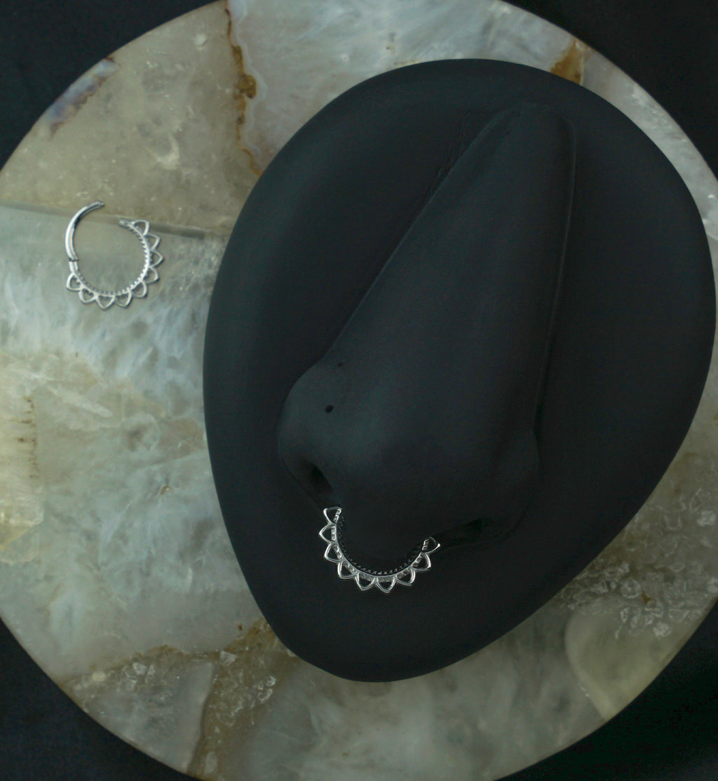 Cute hinged segment rings with multiple little hearts along the edge. Made of 316L Stainless Steel, this ring features a hinged segment for effortless opening and closing. Perfect for septum piercings, it comes in a size of 16G and an inner diameter of 5/16" (8mm), sold individually. For healed piercings.