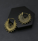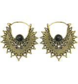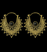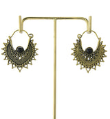 Lightweight yellow brass earrings/hangers with an ornately decorated design with a onyx stone inlay in the center. Size is 18G. Measures at 40mm x 35mm. Weight is about 14 grams each. Made from brass. Not meant for long term wear. May oxidize under extreme moisture conditions. Sold in pairs (2pc). For healed piercings/lobes.