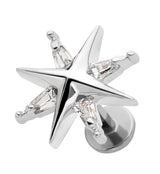 Threadless labret that consists of a north star design that is accented with clear cz gems. Made from 316L stainless steel. Size is 18G with a 1/4" (6mm) length. 4mm flat back. Top design measures at 10mm x 10mm. Sold individually (1pc).
