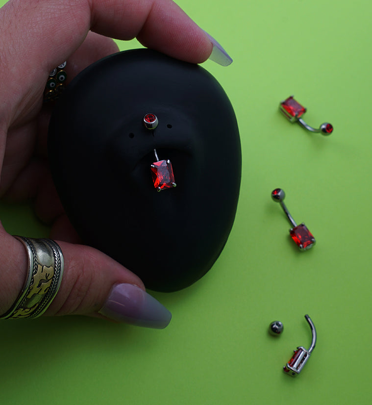 Show off your curves in the most stylish way with this rectangle shaped brass prong red CZ titanium belly button ring! Crafted of ASTM F-136 titanium and brass, the externally-threaded ring features two dazzling red cubic zirconia gems, bezel set top size is 5mm and rectangle shaped, prong set bottom size is 8mm. Please note that the barbell is titanium and the bottom gem is set in brass. Brass is not meant for long term wear, it may oxidize under extreme moisture conditions. For healed piercings. Sold individually (1pc).