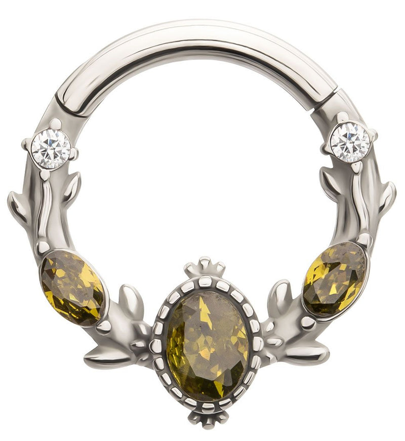 This hinged segment ring has vine design that is accented with clear cz gems and beaded, olive green cz gems, including several oval gems. Made from 316L stainless steel. Inner diameter size is 3/8" (10mm) with your choice of gauge size: 16G or 14G. The hinged design makes this piece easy to put in and remove. Sold individually. For healed piercings.