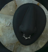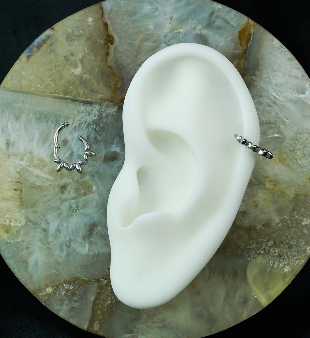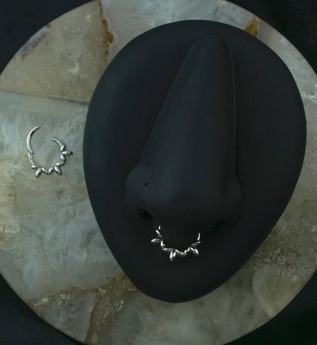 This 16G ring features a hinged segment for hassle-free opening and closing along with an olive leaf design along the bottom. Made with 316L stainless steel, it is sold individually and has an inner diameter size of 5/16" (8mm). Perfect for healed piercings and adds a fun touch to septum or cartilage piercings.