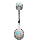 Shining synthetic white opalite belly button ring that is perfect for your navel piercing! Made from durable ASTM F-136 titanium. Size: 14 Gauge. Length: 7/16" (11mm). Gem sizes are 4mm and 6mm. Internally threaded. Sold individually. (1pc).