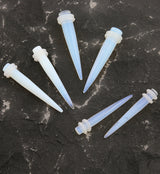 White opalite glass tapers! These are made from opalite glass and come with 2 black or clear "O" rings each. Available in sizes 6G (4mm) - 00G (10mm). Sold individually. If you'd like a pair, change quantity to 2.